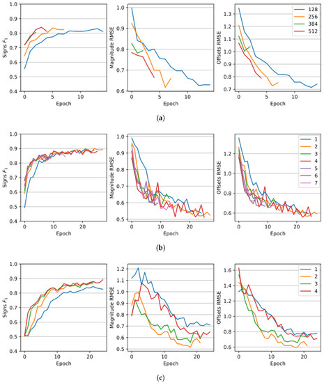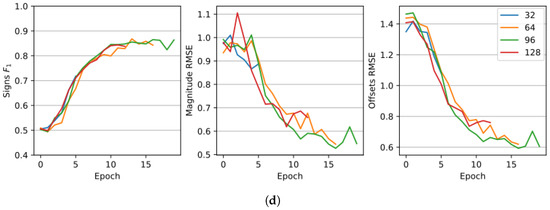 The ablation study consisted of a grid search of the optimal value of several hyper-parameters. There were a series of trials on the UZH-FPV dataset where each one is performed using the base configuration of the model, described in Section 4.3 and Table 2, with a single variation of a parameter. LOO and k-fold cross-validation schemes would require training several instances of the same model on different splits of the dataset and averaging the results. However, from a computational point of view, this would be infeasible. Given that, we chose the compromise to keep fixed training and validation sets to only train a single model once for each combination of parameters. The training and the validation sets are, respectively, random and of windows in the dataset. This is a common proportion in the related works and is inspired by the Pareto principle [67]. The results of the ablation study are shown in Table 5 and graphically in Figure 3. Each row in Table 5 represents the trial’s results using different values from the base configuration for specific parameters. An early stopping mechanism has been implemented to stop a trial whenever the training loss does not improve for three consecutive epochs. The metrics used are the same as Section 4.3: the on signs and RMSE on offsets and magnitudes. The parameters that have been tested are the amount of dropout, the hidden size d, the number of attention heads in the MHA, the number of encoders or decoders in each transformer encoder and transformer decoder, the multiplier for the noise added to , and the dimension of the patches in the VRB .