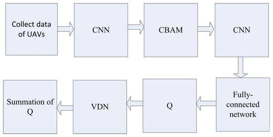 where the represent every agent’s own observations and is learned by back propagating gradients according to the joint summation reward, rather than the specific reward of agent i, is the history tuple of one agent. For the improved summation reward, are action–value functions that consist of all particular rewards of the UAVs, without any other constraints. The overall architecture is shown in Figure 1.