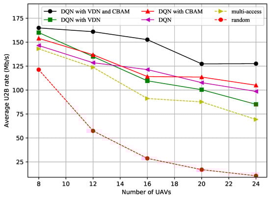 Figure 2 shows how the average U2B link data transfer rate varied with the number of UAVs. More interference was generated as the number of UAVs increased, which caused the decrease in the average data transfer rate. The average data transfer rate, obtained using the random and multichannel access methods, was always lower than that obtained by other methods, especially the DQN with CBAM or with both the VDN and CBAM. From this it can be inferred that the improved DQN with CBAM method, or the method with both the VDN and CBAM, will maintain a high communication rate as more UAVs are added to the multi-UAV formation.