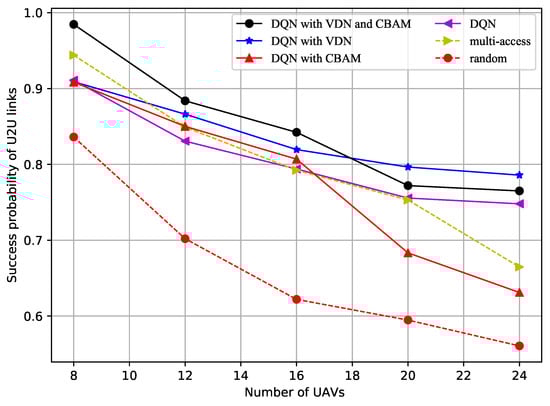Figure 3 shows how the successful data transfer probability of the U2U links varied with the number of UAVs. More interference was generated as the number of UAVs increased, which caused the decrease in the successful data transfer probability. The successful data transfer probability obtained using the random method was always the lowest. When there were only 8 UAVs, the successful data transfer probability using the multichannel access method was not low, but it went down quite fast as the number of UAVs increases. From this figure, it can be inferred that the improved DQN with VDN method, or the method with both the VDN and CBAM, will maintain a high successful data transfer probability, as more UAVs are added to the multi-UAV formation.