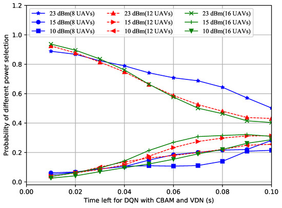 Probability of power selection vs. remaining time for the DQN with the CBAM and VDN.