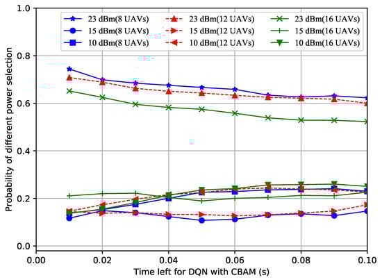 Probability of power selection vs. remaining time for the DQN with CBAM.