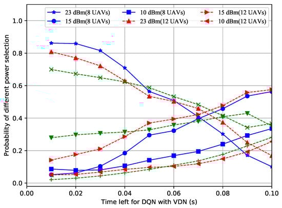 Probability of power selection vs. remaining time for the DQN with VDN.