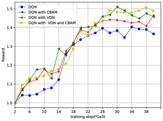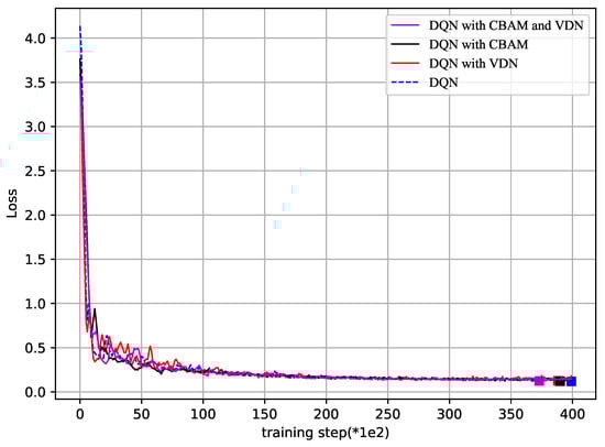 Finally, Figure 7 and Figure 8 show how the reward and loss varied in the overtraining step, respectively, to show the convergence of the proposed DQN and the improved DQN. The axis label “training step()” represents every number times 100 or 1000, with a maximum of 40,000 training steps. With 40,000 training steps, the reward and loss gradually converged, despite some fluctuations. From Figure 7, the reward was bigger in the improved DQN than that in the DQN method. In Figure 8, the lowest points of loss are marked. It is obvious that the DQN with the VDN or CBAM always reached the lowest point earlier than with the DQN alone, and the method with both the VDN and CBAM was the earliest one. The two figures further illustrate the effectiveness and convergence of the improved method.