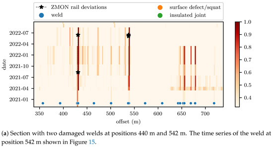 The process of linking rail defects, of a general nature, to weld-specific defects was initiated by extracting all rail faults from the ZMON database for the portions of track evaluated as part of this PoC. These rail defects were then associated to the presence of a weld in their vicinity, allowing for a tolerance of 10 m to account for potential inaccuracy in the reported positions. The resulting matches were then visually verified by the authoring team using the image system in order to minimize occurrence of wrong matches due to positioning uncertainties. This process resulted in labels for approximately 544 damaged welds out of the original set of 25,000 labels. In the absence of a label, a weld was assumed to be healthy for the classification process in Section 4.2, which was naturally a strong assumption, since certain welds may simply have failed to be picked up as defective.