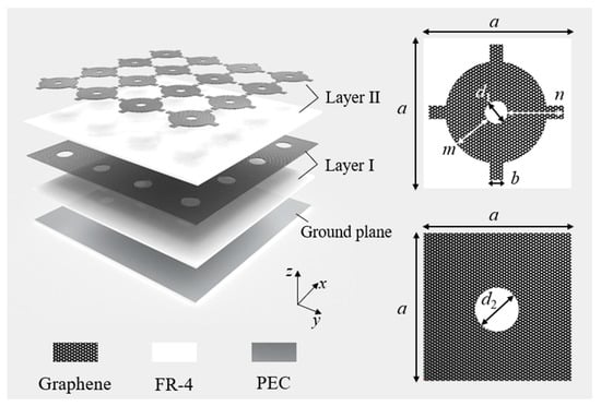 The unit cell geometry of the proposed FSS absorber is shown in Figure 2. The graphene-based lossy FSS was imprinted on a 0.25 mm thick low-cost FR-4 substrate (ε = 4.3). The purpose of using a two-layer lossy structure was to obtain a large bandwidth. Both the lossy layer I and lossy layer II had an absorption band. Combining the two lossy layers obtained an ultrawide absorption band. The symmetric graphene coating structure made the absorber insensitive to different incident polarization. To ensure zero transmission, a ground plane was provided on the bottom of another FR-4 substrate of the same thickness. After calculation and simulation, the optimized geometrical design parameters are shown in Table 1. Among them, h1 represents from the lower part of the bottom plate to the lower surface of lossy layer I, and h2 represents from the lower surface of lossy layer I to the lower surface of lossy layer II.