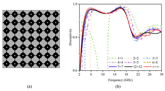 To further facilitate this research, the absorption performances of different finite-size structures were modeled and simulated through the FSS FULL STRUCTURE function of CST Microwave Studio, as presented in Figure 3. It can be seen that, when the unit cells were less than 6 × 6, the absorption performance of the proposed structure at lower frequencies was not very good due to the relatively large wavelength, and it became better as the number of units increased. With the unit of 7 × 7, the absorption behavior was similar to the one with an infinite periodic structure. Therefore, to obtain more accurate results, the unit cell of the final structure should be more than 7 × 7.