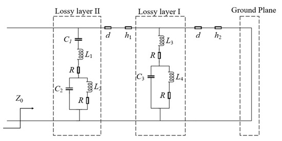 As shown in Figure 4, the functioning of the proposed structure was further analyzed based on the corresponding equivalent circuit model (ECM). The incident wave leads to the generation of surface currents. Due to these surface currents on metallic designs, inductive and capacitive effects are induced, which can be modeled by the corresponding inductors and capacitors, respectively. The dielectric and air layers can be replaced by separate transmission lines. The thickness of the lossy layer I and the lossy layer II can be characterized using a short transmission line model with characteristic impedance and length equivalent to the thickness of substrates (d). Here, Z0 = 377 Ω represents the free space wave impedance, and is the relative permittivity of the dielectric material.