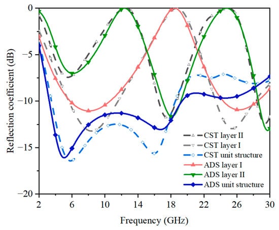 The ECM and unit cell geometry of the proposed FSS absorber were simulated using Keysight Advanced Design System (ADS) software and CST Studio Suite (CST) software, respectively. The simulated reflection coefficients (S11) of the lossy layers are shown in Figure 5; under the normal incident angle, the reflection band below −10 dB ranged from about 3 GHz to 19 GHz. Both the circuit simulation and the full-wave simulation showed close matches with each other. Furthermore, the proposed FSS absorber geometry had axial symmetry and, therefore, exhibited a polarization-insensitive characteristic.