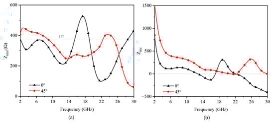 Moreover, the input impedance of the absorber was extracted through the simulated S parameter, to quantitatively explain the working mechanism of the absorber. The real and imaginary parts of the impedance at 0° and 45° are shown in Figure 6, which proves that the impedance at 45° was indeed better than that at 0°. As shown in Figure 6a, the real part of the impedance of the absorber at 45° was closer to 377 Ω than that at 0° from about 4 GHz to 26 GHz. At around 6 GHz and 15 GHz at 0° and around 22 GHz at 45°, the real part was very close to 377 Ω, and the imaginary part was close to 0. As a result, the impedance matching should be better. This corresponded to the absorption peaks in Figure 7. The frequency points close to zero of the imaginary part and those close to 377 of the real part both moved to high-frequency bands, which means that the absorption bandwidth may become larger. This corresponded to the result in Figure 7, which showed clearly that the absorption band extended from 18 GHz to 26 GHz.