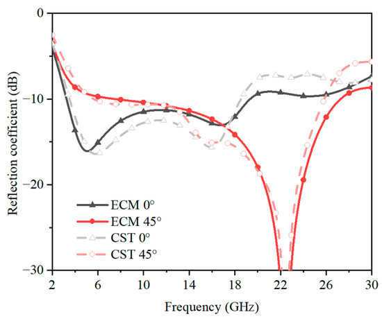 The reflection coefficient at 0° and 45° of the ECM and CST.