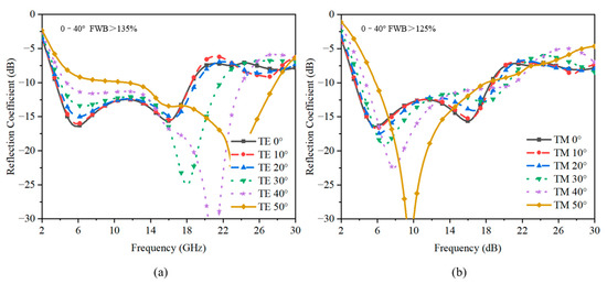 The performance of the design under different oblique angles of incidence was also studied to determine the suitability of the absorber for applications demanding stable performance at large oblique angles. Figure 8a illustrates the simulated TE reflection coefficients of the absorber under oblique incidences. The results show clearly that the −10 dB reflection band extended from about 18 GHz to 26 GHz as the incident angle increased. In Figure 8b, when the incident angle increased to 40°, no significant occurrence of the reflection coefficients’ deterioration of TM polarization was observed around the frequency of operation. Overall, the absorption bandwidth varied slightly at a low frequency band and optimizes obviously at a high frequency band. So, the presented absorber has good angular stability up to about 50°.