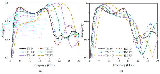 To show more clearly the absorption performance of the presented structure, the absorptivity results are shown in Figure 9. The figure illustrates that the absorptivity could be maintained above 90% in the operating band when the incident angle increased up to 50°, which means that the structure has good absorption stability.