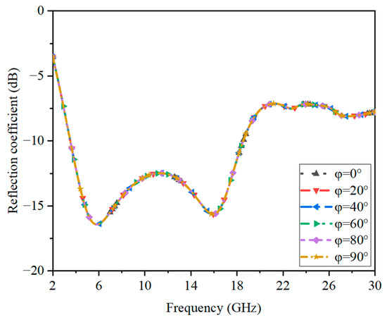 In Figure 10, the reflection coefficients under different polarization angles are shown to prove the presented structure had polarization insensitivity. The angle of polarization was rotated from 0° to 90°. The results had no differences, which illustrates that the absorber featured polarization-insensitive performance.