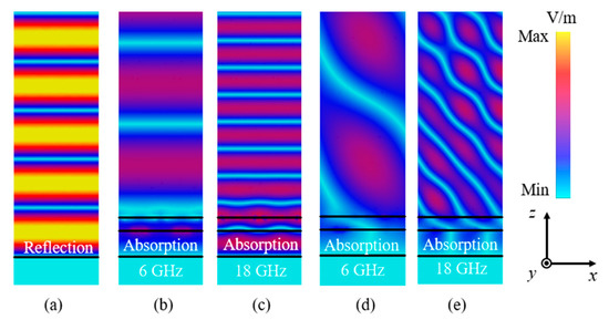 Electric field distributions on the plane of the propagation direction of the incident wave. (a) Reflection phenomenon of the EM waves; (b,c) absorption phenomenon at 6 GHz and 18 GHz under the normal incident angle, respectively; (d,e) absorption phenomenon at 6 GHz and 18 GHz under the 50° incident angle, respectively.