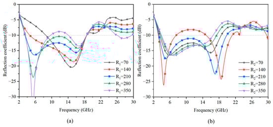 Then, the sheet resistance of the graphene flake was analyzed. Figure 12a,b illuminate the reflection performance of the FSS absorber structure with different sheet resistances of R1 and R2 both in the range of 70–350 Ω/sq. As shown in Figure 12a, the R1 sheet resistance mainly affected the lower frequency absorption peak. In Figure 12b, it can be observed that the R2 sheet resistance mainly affected the absorbing bandwidth.