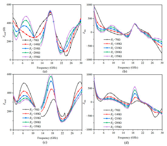 The changes in the sheet resistance R1 and R2 directly influenced the real part and imaginary part of the impedance. As shown in Figure 13a,b, R1 mainly affected the real part at the low-frequency absorption band and slightly affected the high-frequency absorption band. Figure 13c,d indicate that R2 influenced the real part at both the low-frequency and high-frequency absorption peaks. Meanwhile, the frequency point near zero of the imaginary part of the impedance moved, which means the range of the absorption band may change. The analysis of the real and imaginary parts of the impedance corresponded well with the absorption performance in Figure 12.