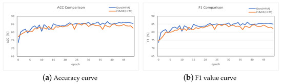 Figure 4 depicts the accuracy and F1 value curves of our model and CLMLF on the HMM test set after 50 epochs of training. As shown in Figure 4a, our model has a shorter growth curve and higher accuracy than CLMLF in terms of accuracy as a percentage of the total sample of correctly predicted results. In comparison to CLMLF, our proposed model’s performance fluctuates less and gradually stabilizes after 40 epochs. F1 Score is a statistical measure of classification model accuracy that is a harmonic average of model accuracy and recall. Figure 4b shows that our model achieves an F1 value greater than the CLMLF of 1.35% and stabilizes after 40 epochs, resulting in better classification results.