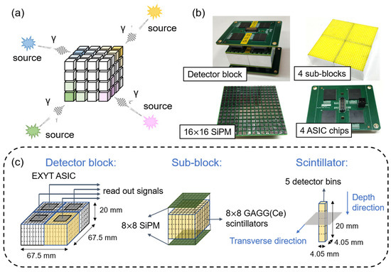 The signals of SiPM arrays were read by a lab-developed ASIC chip [41]. Since each ASIC had 8 × 8 channels, we virtually divided the detector block into 2 × 2 sub-blocks (Figure 1b,c), and each sub-block contained 8 × 8 GAGG(Ce) scintillators. One should note that the sub-block division strategy impacts the detector performance as well as the denoising process (see Section 2.3 and Section 2.4 for details).