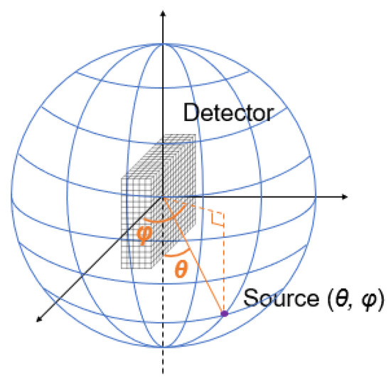 To formulate the imaging problem, we defined a spherical coordinate system with the origin at the geometrical center of the detector. As shown in Figure 2, the image was defined on a 4π-view sphere surface, denoted by the polar angle θ and azimuth angle φ. We discretized the image domain into 181(θ) × 360(φ) pixels with a pixel size of 1° × 1°. The radioactivity in the i-th image pixel is denoted as .