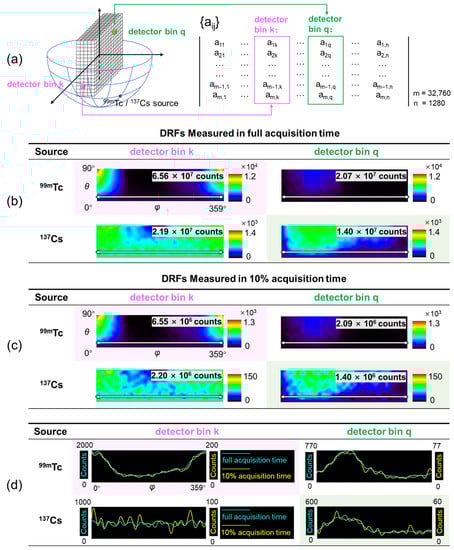 (a) Illustration of the geometrical relationship between calibration measurement (left) and the measured SM (right). (b) DRF images of two representative detector bins for 99mTc and 137Cs sources (measured with the full acquisition time). (c) DRF images of two representative detector bins for 99mTc and 137Cs sources (measured with a 10% acquisition time). (d) Line profiles of DRF images measured with the full acquisition time (with scale marked on the left) and 10% acquisition time (with scale marked on the right).