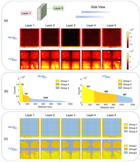 In Figure 5b, we show the total counts in each detector bin in descending order, and the grouping result is labeled with different colors. In both cases of the 99mTc and 137Cs sources, we defined three data groups. For the 99mTc source, there are 75 DRFs in Group 1 with an average count level of 1.6853 × 108, 167 DRFs in Group 2 with an average count level of 6.9547 × 107, and 1038 DRFs in Group 3 with an average count level of 2.1096 × 107. For the 137Cs source, Group 1 has 307 DRFs with 2.4511 × 107 counts on average, Group 2 has 566 DRFs with 1.6439 × 107 counts on average, and Group 3 has 407 DRFs with 1.0682 × 107 counts on average.