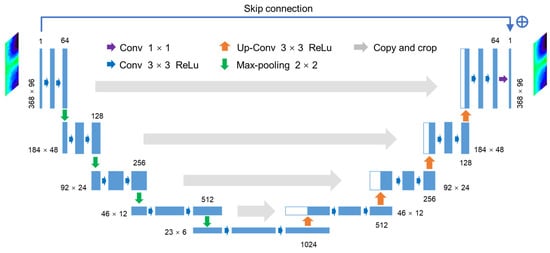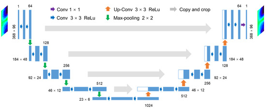 Figure 6 illustrates the U-net network architecture in this study. The width of each block indicates the number of feature maps in the layer, the length denotes the input size of the matrix, and the arrows stand for different operations. The entire network consists of an encoder, a bottleneck, and a symmetrical decoder, making up a U-shape. The encoder contains four stacks; in each stack, there are 2 convolutional layers with a 3 × 3 kernel followed by a rectified linear unit (ReLU), and a 2 × 2 max pooling layer with a stride of 2. The bottleneck has 2 convolutional layers. The decoder consists of four stacks of convolutional layers and up-convolutional layers which expand the feature maps. A fully convolutional layer is added to the end to match the feature maps to the label. Between the encoding layers and their corresponding decoding layers, there are skip connections to propagate low-level features to high-resolution layers and compensate for information loss in max pooling.