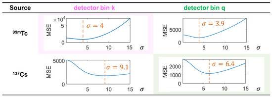 where σ denotes the standard deviation of the Gaussian kernel function. To obtain the best Gaussian filtering performance for fair comparisons, we tested on the LC-SM (Imager 1) data (multiplied by 10 to match the magnitude of FS-SM (Imager 1)) with σ ranging from 0.1 to 15 pixels with a step size of 0.1 pixels for each detector bin. We used a figure-of-merit of the mean square error (MSE) between the full-count DRF image and the filtered low-count DRF image to determine an optimal σ for each DRF. Figure 8 illustrates the MSE curves of two representative detector bins (as indicated in Figure 4a) for 99mTc and 137Cs sources. The optimal σ values that yielded the smallest MSE are marked in each sub-figure.