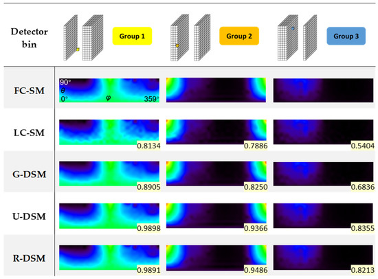 For a single detector bin, gamma photons emitted from different directions have various detection probabilities because of different attenuation distances between sources and the detector bin induced by other detector bins along the path. The total acquired counts in each detector bin and for each radiation source are marked in the upper-right corner of each DRF image in Figure 4b.