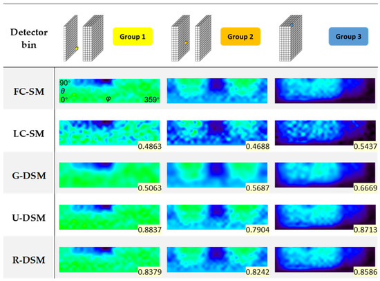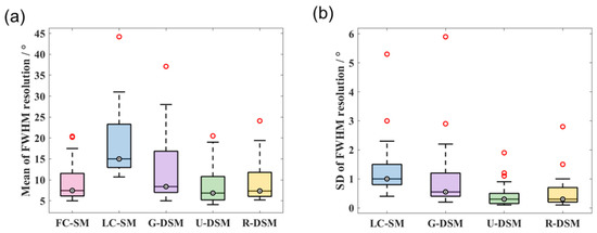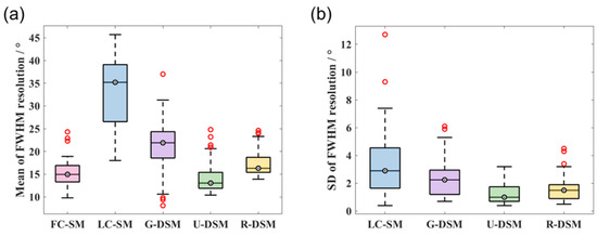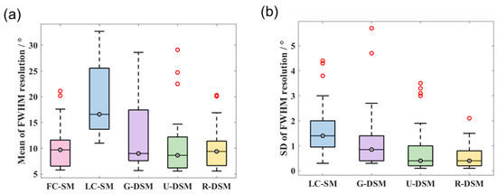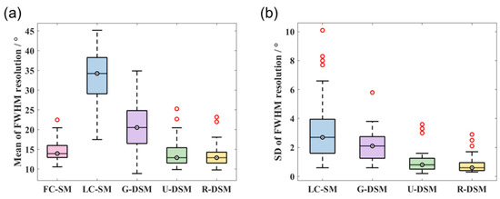 The mean and SD values of FWHM resolution for 99mTc and 137Cs at 36 different source positions are shown in Figure 16 and Figure 17, respectively. For the 99mTc source, the mean resolution for FC-SM, U-DSM, and R-DSM mostly stayed below 20°, better than LC-SM and G-DSM. For the 137Cs source, both U-net- and Res-U-net-based deep learning methods achieved around 10~20° image resolution with a few exceptions, outperforming the 20~45° resolution with LC-SM and 10~35° with G-DSM. The SD values of U-DSM and R-DSM were also much lower for both 99mTc and 137Cs sources, indicating that the SMs with deep learning denoising methods yield more robust image reconstruction.