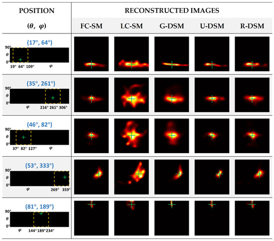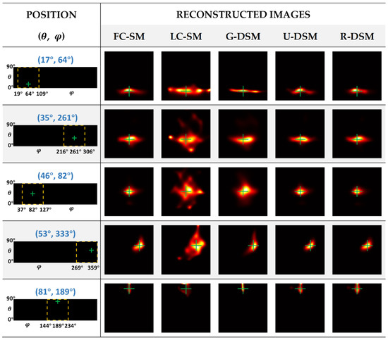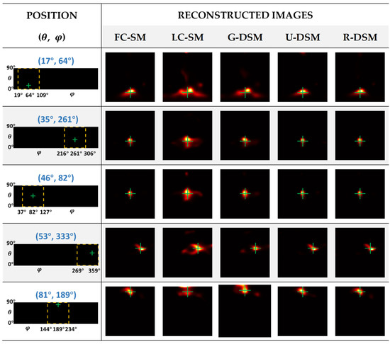 Reconstructed images of different SMs at representative positions for 137Cs source in inter-device evaluation.