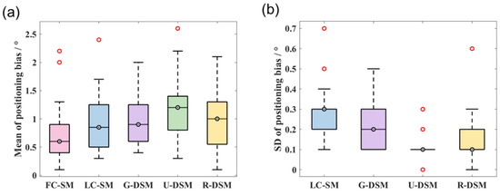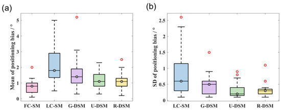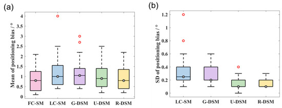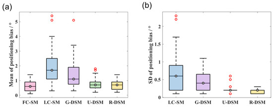 Quantitative analyses of the mean and SD values of positioning bias are summarized in Figure 20 and Figure 21 for the two radiation sources. For the 99mTc source, the positioning bias is <2.6° in all cases. Although the image quality of LC-SM has an evident degradation, as shown in Figure 18, the positioning bias does not significantly increase, probably due to the centroid calculation step. In general, LC-SM, G-DSM, U-DSM, and R-DSM show comparable positioning accuracy, among which U-DSM performs slightly poorer. However, as shown in Figure 20b, the SD values of positioning bias for U-DSM and R-DSM are significantly smaller than those for other cases. For the 137Cs source (Figure 21a), U-DSM and R-DSM achieve <2.5° average positioning bias, close to that of FC-SM. For LC-SM and G-DSM cases, the mean positioning bias is higher, ranging up to 5°. In Figure 21b, the SD values of the positioning bias for U-DSM and R-DSM cases outperform those for LC-SM and G-DSM cases.