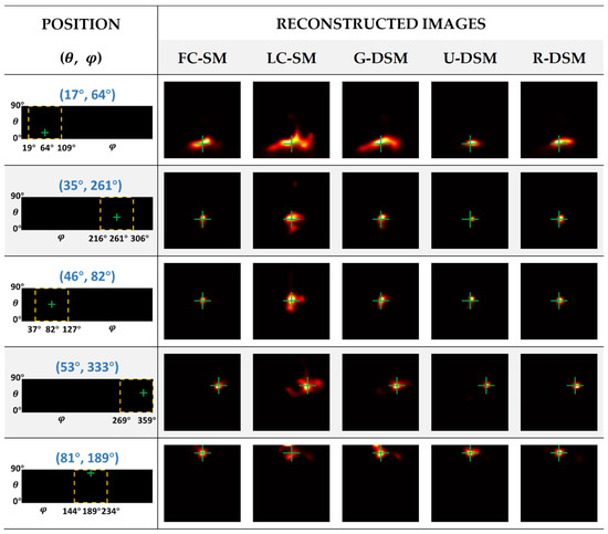 As described in Section 2.4.2, for inter-device evaluation, we trained the denoising networks with data measured in Imager 1 and applied the networks in the denoising tasks for Imager 2. Figure 18 and Figure 19 show the reconstructed images of 99mTc and 137Cs point sources at five representative positions. The images in the second to sixth columns correspond to the reconstructed images using an FC-SM, an LC-SM, and three denoised SMs with the Gaussian filtering method (G-DSM), with the U-net-based denoising method (U-DSM), and with the Res-U-net based denoising method (R-DSM). One can observe severe distortion with a noisy LC-SM (third column) or G-DSM (fourth column). U-DSM and R-DSM (fifth and sixth columns) yield better image quality and visually more similar image shapes to the FC-SM cases (second columns).