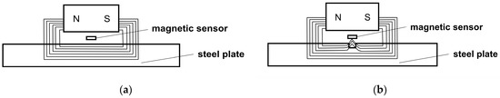 Schematic diagram of the magnetic flux leakage detection principle. (a) no defect; (b) defective.