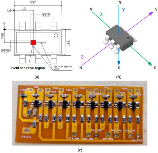 3D magnetic sensor. (a) Three-dimensional magnetic sensor size diagram; (b) 3D magnetic sensor physical picture; (c) Three-dimensional magnetic sensor array.