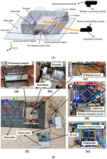 If there is a defect in the ferromagnetic steel plate, the location and size of the defect can be determined using the encoder’s length and the sensor array’s three-dimensional magnetic field signal.