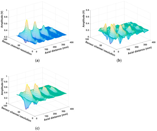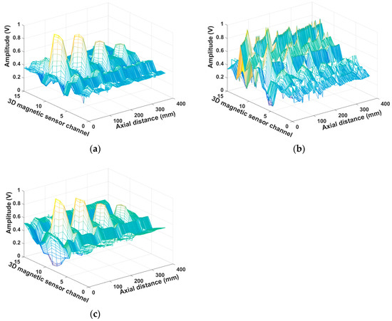 3D MFL signals after interpolation of 15 channels. (a) x axis after interpolation; (b) y axis after interpolation; (c) z axis after interpolation.