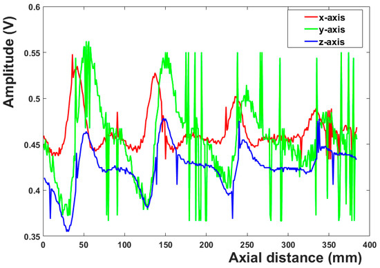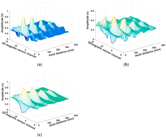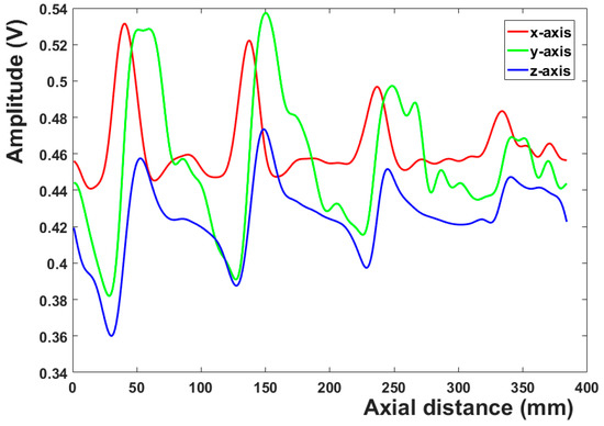 The three-dimensional magnetic leakage signals of 15 channels after noise reduction are shown in Figure 6a–c. The noise signals are effectively suppressed, and the characteristics of the magnetic leakage signals at the defects are very obvious. Figure 7 depicts the 3D magnetic leakage signal after noise reduction in the eighth channel. It is clear that after noise reduction, the curve of the 3D magnetic leakage signal is smooth, and the signal’s characteristics are obvious. The X-axis magnetic leakage signal will peak at the defect, and the Y-axis and Z-axis magnetic leakage signals will peak and trough. Noise reduction improves the ability to characterize defects in signals.