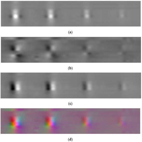 Current magnetic flux leakage images are almost gray images; however, color images aid in defect identification. In this study, the X-, Y-, and Z-axes magnetic flux leakage signals after denoising, normalization, and cubic spline interpolation were mapped to the red, green, and blue color channels, respectively. The weights of all three color channels were 1. Therefore, a color image of the three-axis magnetic flux leakage signals was produced. When compared to gray images, the defect area in the color image was easier to distinguish from the background, and the defect signal’s characterization ability was stronger (Figure 9).