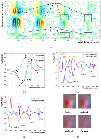 (a) Y-axis flux leakage signal contours for 15 sensor channels; (b) the first defect is in the triaxial leakage field of sensor channel 8; (c) Y-axis flux leakage signal curve of sensor channels 2 and 3; (d) Y-axis flux leakage signal curve of sensor channels 9 and 10; (e) four defect magnetic flux leakage color images.