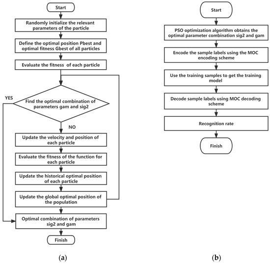 (a) Using particle swarm optimization (PSO) to optimize the regularization parameter gam and kernel parameter sig of LSSVM to find the optimal combination of parameters; (b) PSO-LSSVM flow chart.