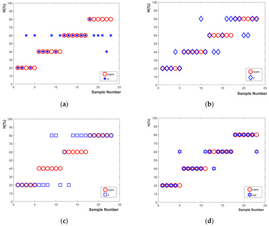 (a) Identification results of X-axis color moment eigenvalues; (b) identification results of eigenvalues of Y-axis color moments; (c) identification results of eigenvalues of Z-axis color moments; (d) identification results of X-axis, Y-axis, and Z-axis color moment eigenvalues.