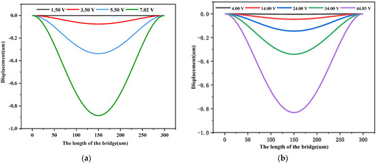 The relationship curves between the deflection of the switch and the control voltage filled with different materials: (a) the surrounding dielectric is air; (b) the surrounding dielectric is glycerol; (c) the surrounding dielectric is silicone oil; (d) the surrounding dielectric is water.