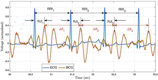 Heartbeat interval estimates from simultaneous ECG and BCG recordings. An R–R interval (RRI) represents the time between consecutive R peaks—the prominent peaks of an ECG that correspond to the onset of ventricular depolarization events. Similarly, a J–J interval (JJI) represents the time between consecutive BCG J peaks, where J peaks are the prominent peaks of a BCG, believed to be generated by blood ejection events at the aortic artery. Variations in RJIs due to physiology are also indicated in this figure, labeled as RJI. Although RJI1, RJI2, and RJI3 are visually similar, they are numerically different. The signal amplitudes are normalized relative to their respective ranges across the entirety of each recording.