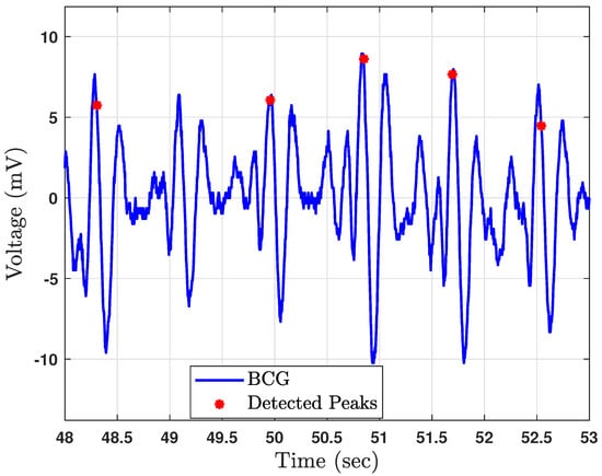 Note that HBI/HRV errors are due to several sources, e.g., physiology, sensing modality, and peak detection algorithm. We focus on those errors stemming from the BCG peak detection process. As observed in our previous works [21,22], peak detection methods introduce perturbations in the temporal locations of detected heartbeats. Missed and false peaks also contribute to HBI errors, but the focus of this research is the HBI error due to peak-detection-based timing jitter. Figure 2 illustrates a sample segment of BCG data where a detected heartbeat does not always align with the actual beat location. Importantly, such a mismatch is not always consistent; the error varies between heartbeats. This variability is due to the unpredictable nature of the error sources.