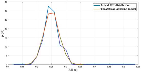 Timing error can come from a combination of many sources, including BCG sensing modality, peak detection algorithm, and participant physiology. If these random sources sum together, the resulting error should be Gaussian by the Central Limit Theorem. In addition, a Gaussian model is a reasonable fit for our measured timing jitter in another study (described in Section 3.5, below). Figure 3 depicts an overlay of the observed RJI distribution (blue line) and that of a theoretical Gaussian model (red line). For this histogram, we removed data from one participant because their BCG was collected from a different location than all other participants in the original study.