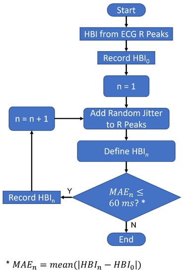 ECG R peaks provided ground truth heartbeat times. We denote an HBI obtained from these R peaks as HBI0, where the zero subscript signifies zero added error. Then we obtained HBIs from the artificially perturbed R-peak locations. We denote HBIs obtained from these R peaks with timing jitter as HBI, where n corresponds to an nth-level of error contamination. Thus, HBI represents an HBI calculated from an R-peak stream with an nth-level error. We increased the standard deviation of these perturbations until we reached a mean absolute error (MAE) between HBI and HBI of 60 ms. We specified 60 ms as a maximum based on the findings in [22], where HBI errors due to the worst-performing method were less than 60 ms for most of the participants. This process took 97 iterations, thus leading to n = 97 levels of synthetic HBI error. Figure 4 illustrates the process of obtaining HBIs with simulated errors starting with ECG R-peak locations provided in each dataset. The process was repeated 50 times to cover all of the datasets included in the study.