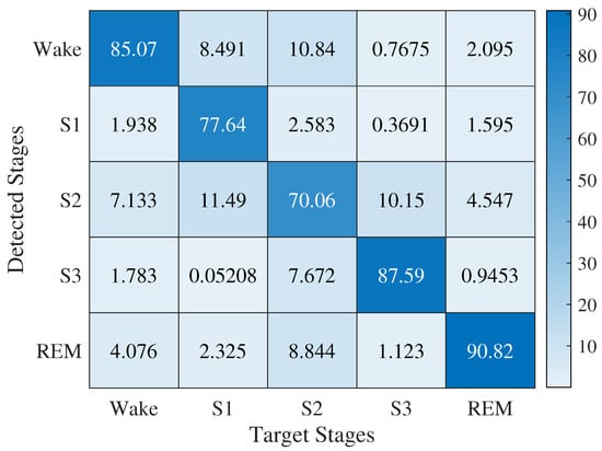 Higher accuracies, of up to 89%, are also reported from other studies, as noted in [27]. However, those studies included other signals for sleep staging, e.g., respiratory effort data [28,29], in addition to ECGs.