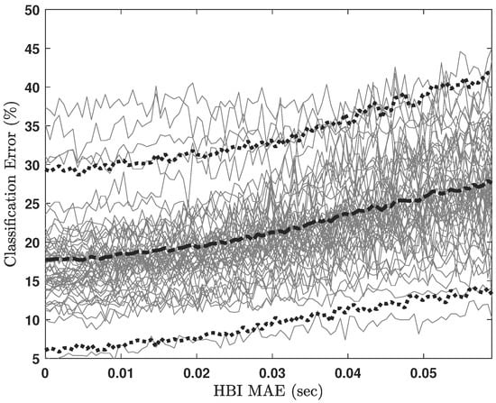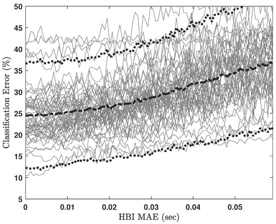 Figure 6 illustrates the SVM classification error as a function of HBI MAE for the micro-labeled sleep stages, and Figure 7 illustrates the SVM classification error as a function of HBI MAE for the macro-labeled sleep stages. In both cases, all HRV features were provided to the classifier. Classification errors for each participant are graphed in light gray lines, whereas the dashed, bold black line in each figure is the ensemble average. As expected, increasing HBI MAE led to increasing sleep staging error. At the same time, the classification error seems to remain low (≤20% in the case of micro-labeled sleep stages) for roughly half of the simulated MAE values.