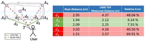 Car keyless entry system (KES) has been emerging as a new trend of car accessing solution [1,2]. Drivers can conveniently access and start the car with a digital key on their smartphone. One important issue of the KES is how to accurately locate the driver’s smartphone to provide a welcome message when approaching the car, unlocking the door when nearing the car, and locking when leaving the car [3]. The proper operation of those functions needs to obtain the accurate position of the keyfob. For example, when the user is standing outside the driver’s door attempting to open it, the KES needs to accurately give a localization result to prove that the keyfob is outside the vehicle, which requires the localization error to be lower than 30 cm. Currently, most existing KESs employ Bluetooth low energy (BLE) to localize keyfobs. BLE’s distance ranging is based on the signal strength and its limitation is that the estimated distance between the BLE nodes is quite sensitive to the environment. Nowadays, ultra-wideband (UWB) technology is becoming a new approach of localizing keyfobs in the KES because it provides precise localization and secure communication [4,5].